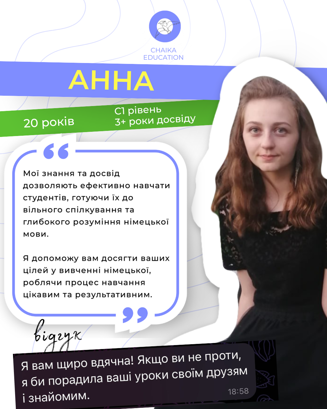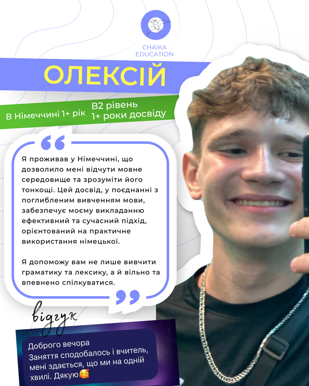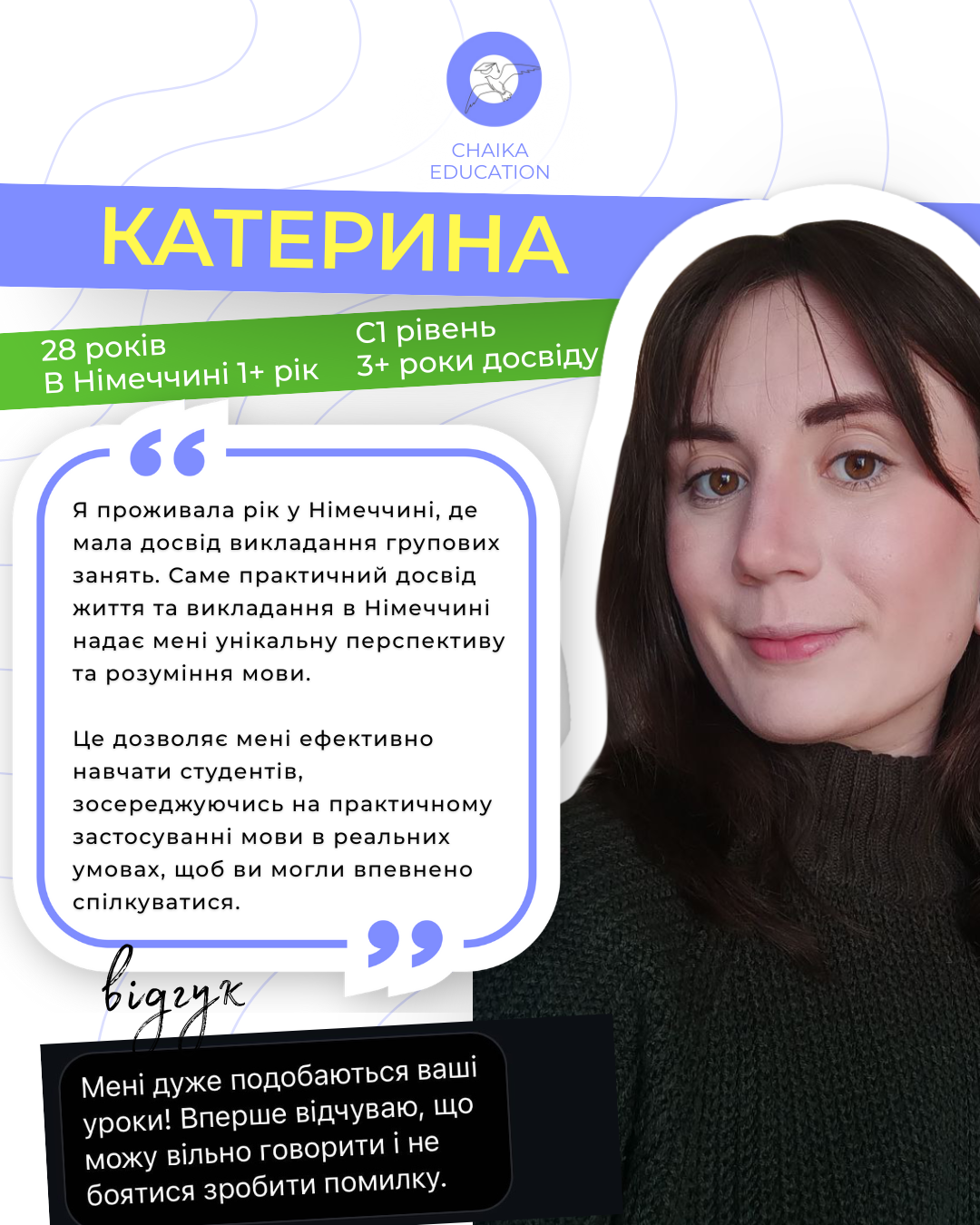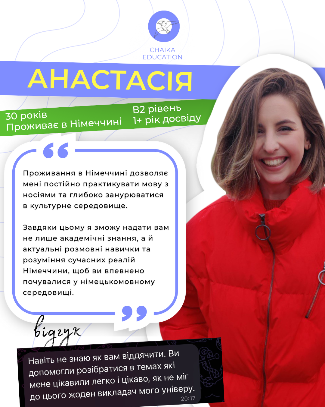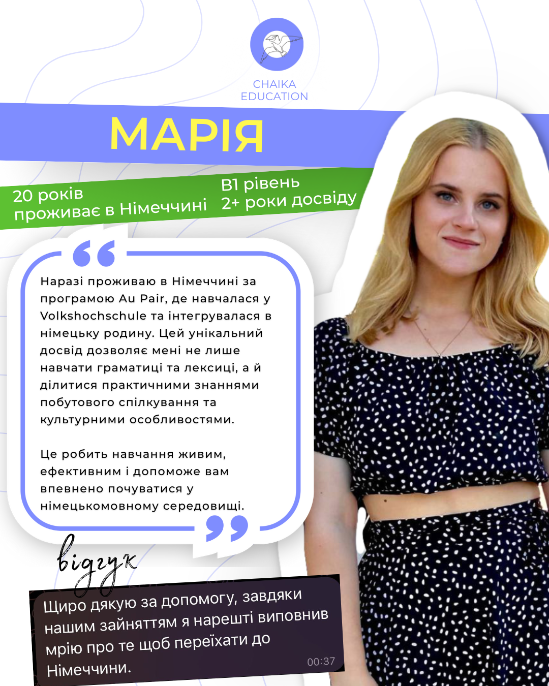 • Chaika Education — це онлайн-простір, де німецька мова стає не сухою теорією, а вашим реальним інструментом для життя, роботи й навчання.